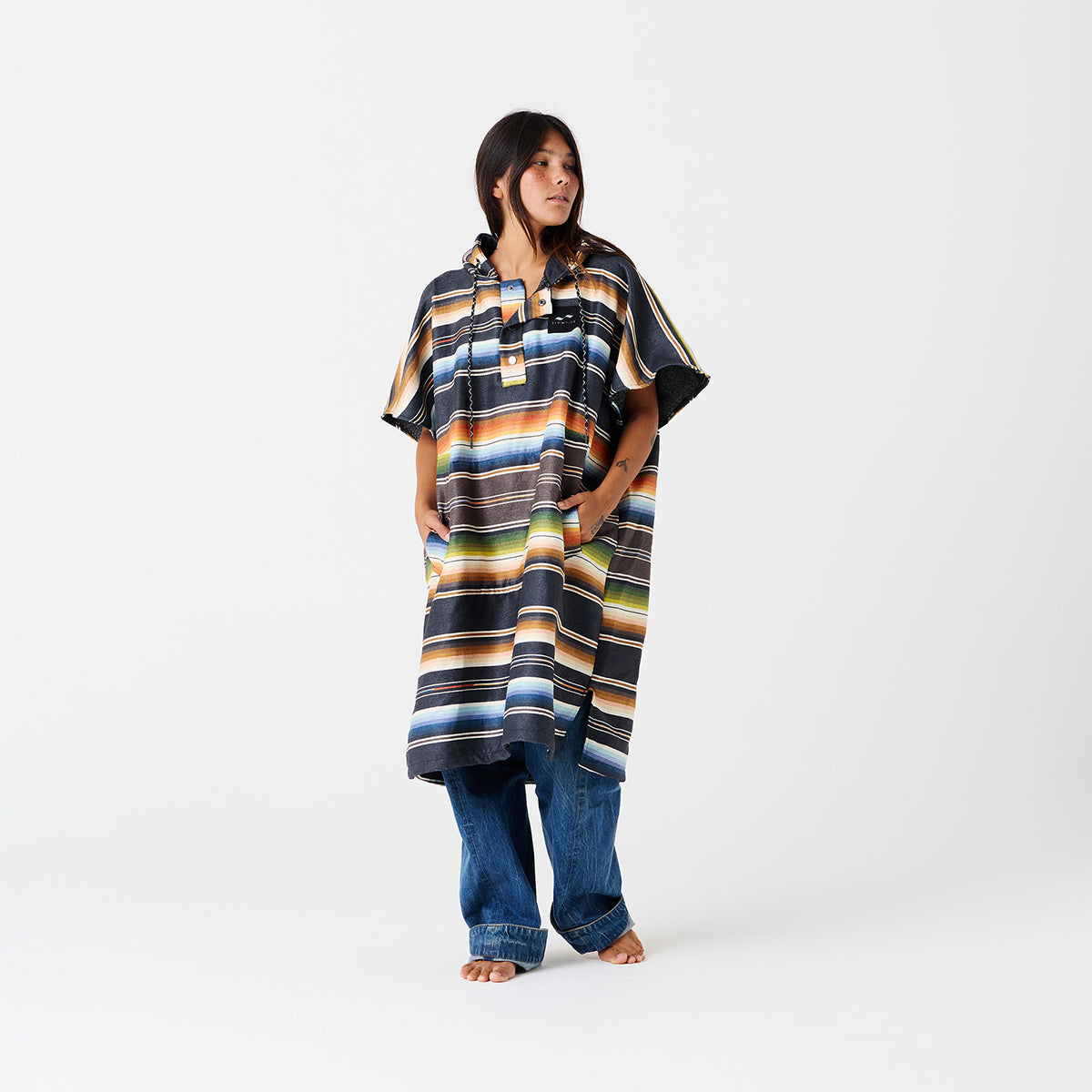 Sustainable Materials: Made from 100% post-consumer waste, primarily plastic bottles. We used approximately 27 to 32 plastic bottles to make this product, depending on the changing poncho’s size. Certified through the Global Recycled Standard. 200 GSM.